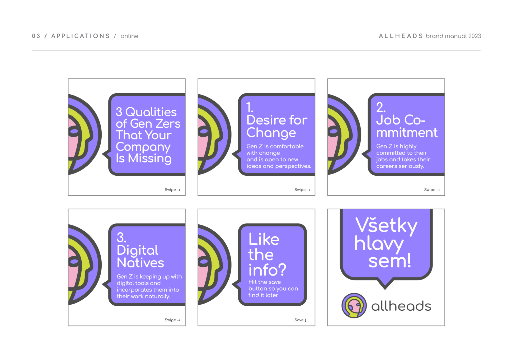 Brand and visual identity design for Allheads, an HR consultancy helping organizations attract, retain and understand Gen Z workforce.